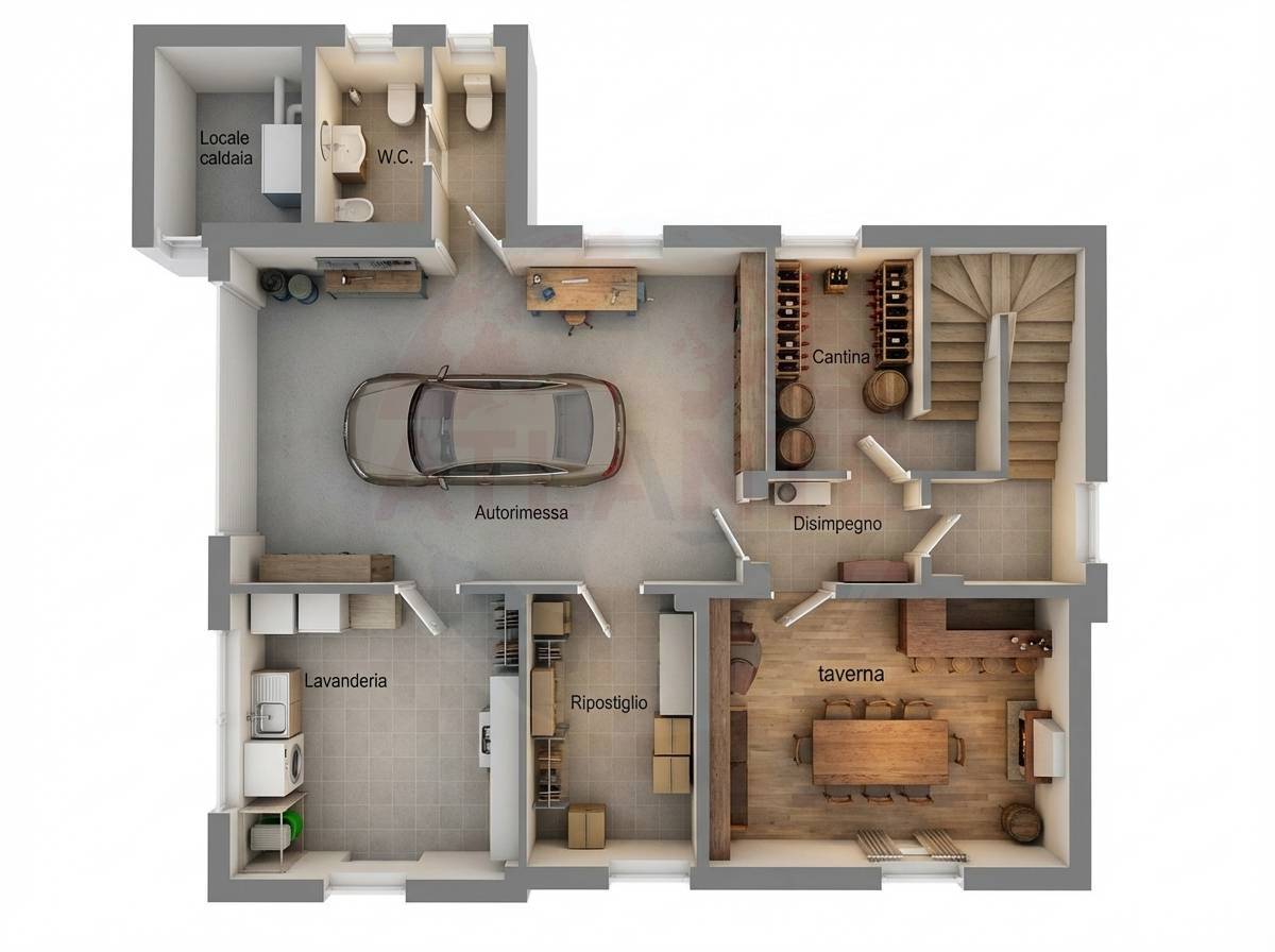 Al piano interrato, questo immobile, offre una taverna completa di camino, un ripostiglio, una spaziosa lavanderia, un secondo bagno ed un’autorimessa doppia dotata di porta sezionale motorizzata.